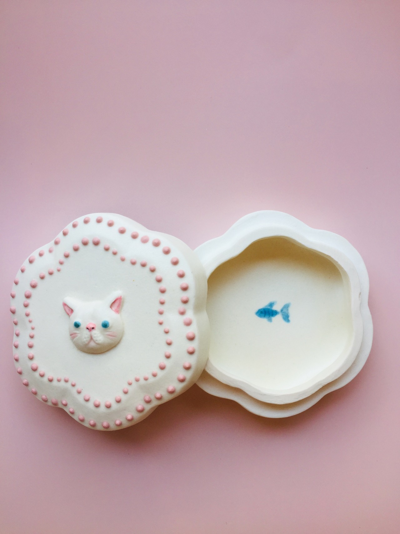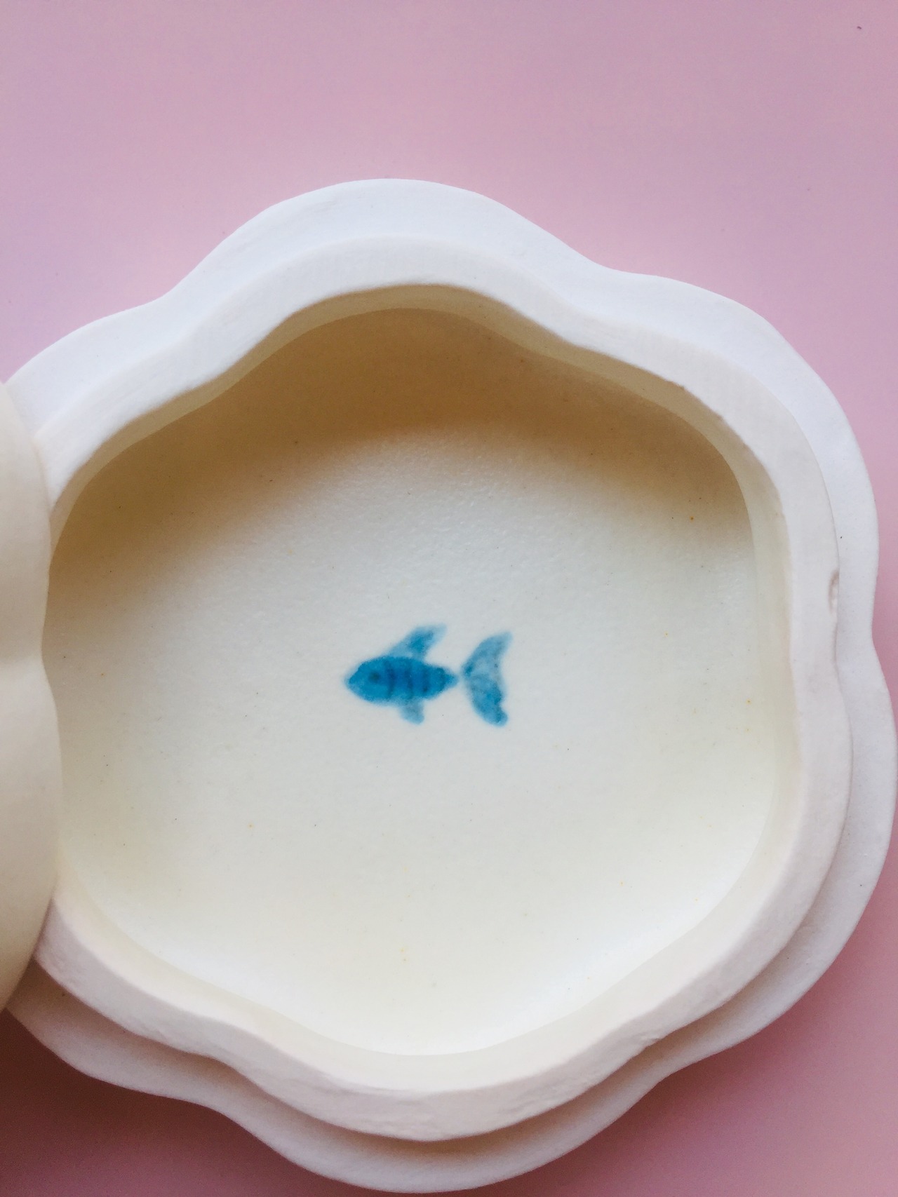 蓋を開けると、入れ物の底におさかなか描かれています。