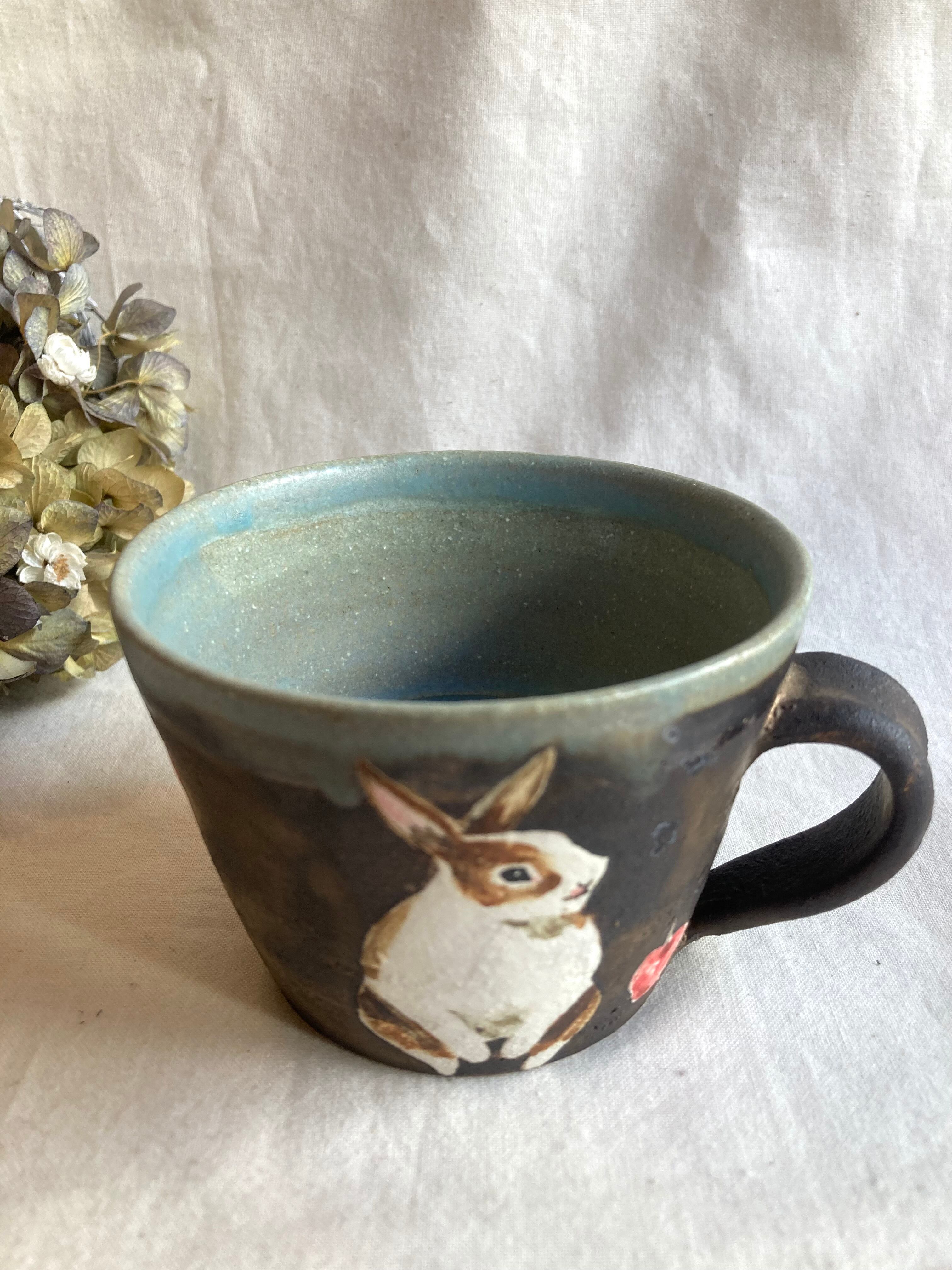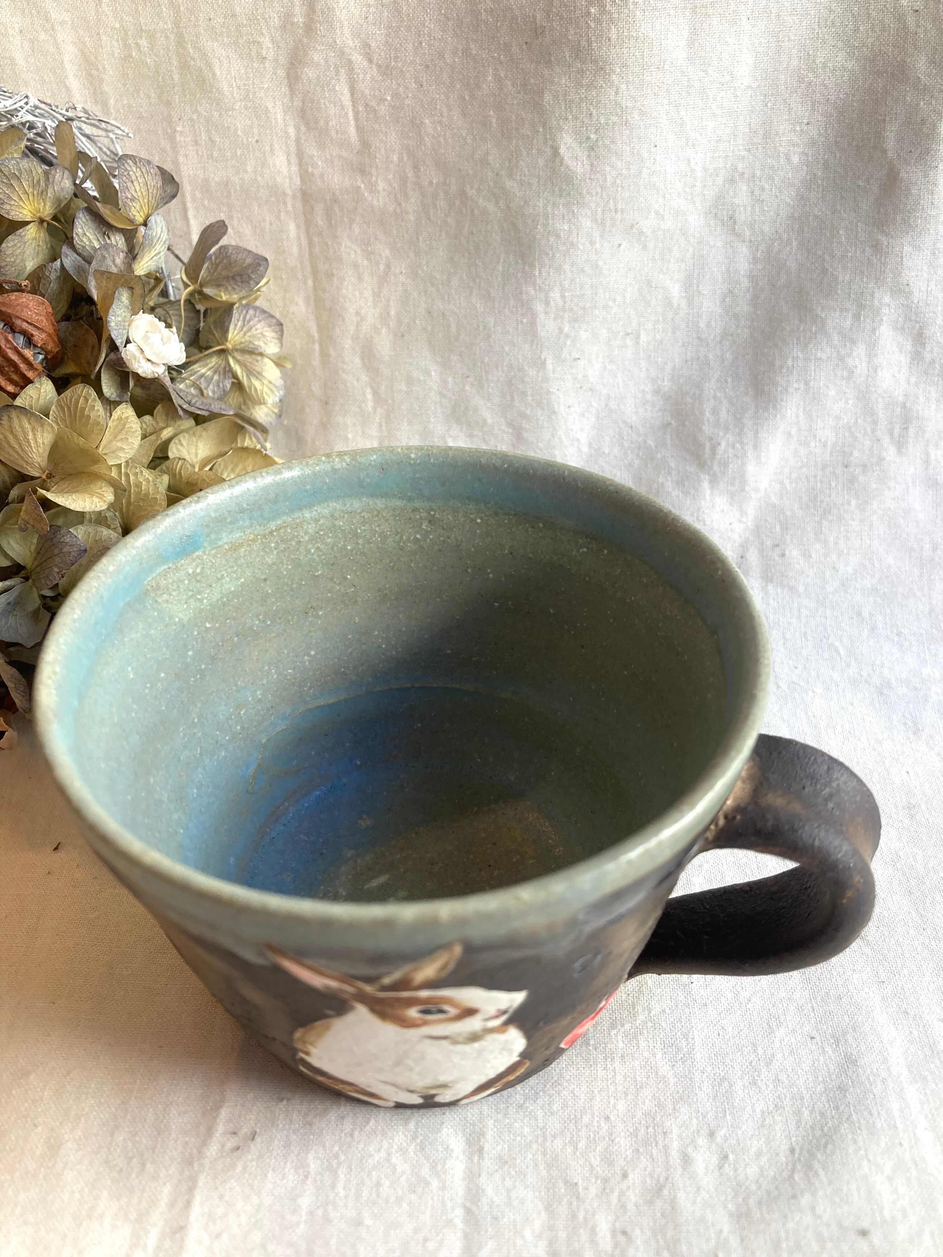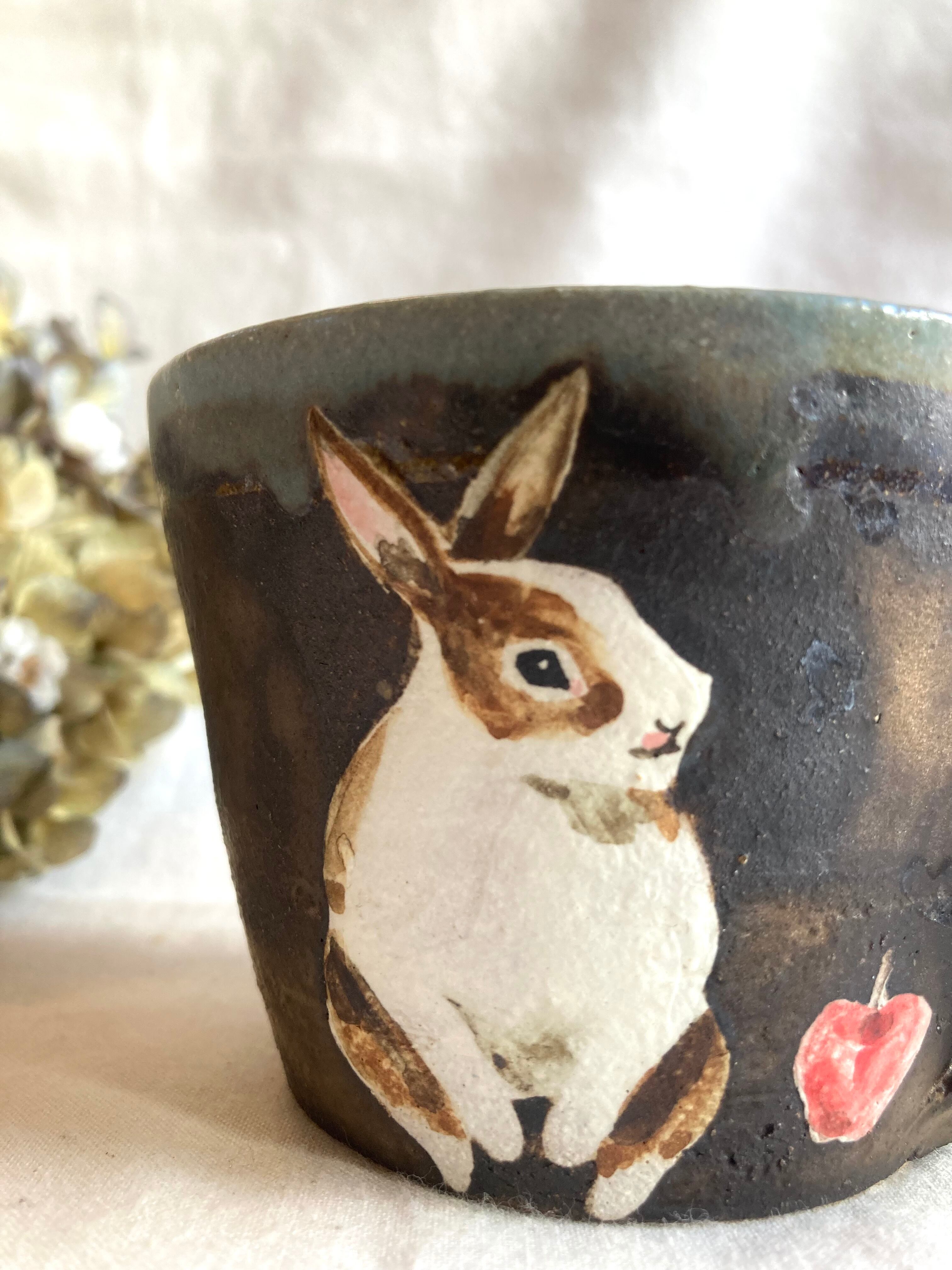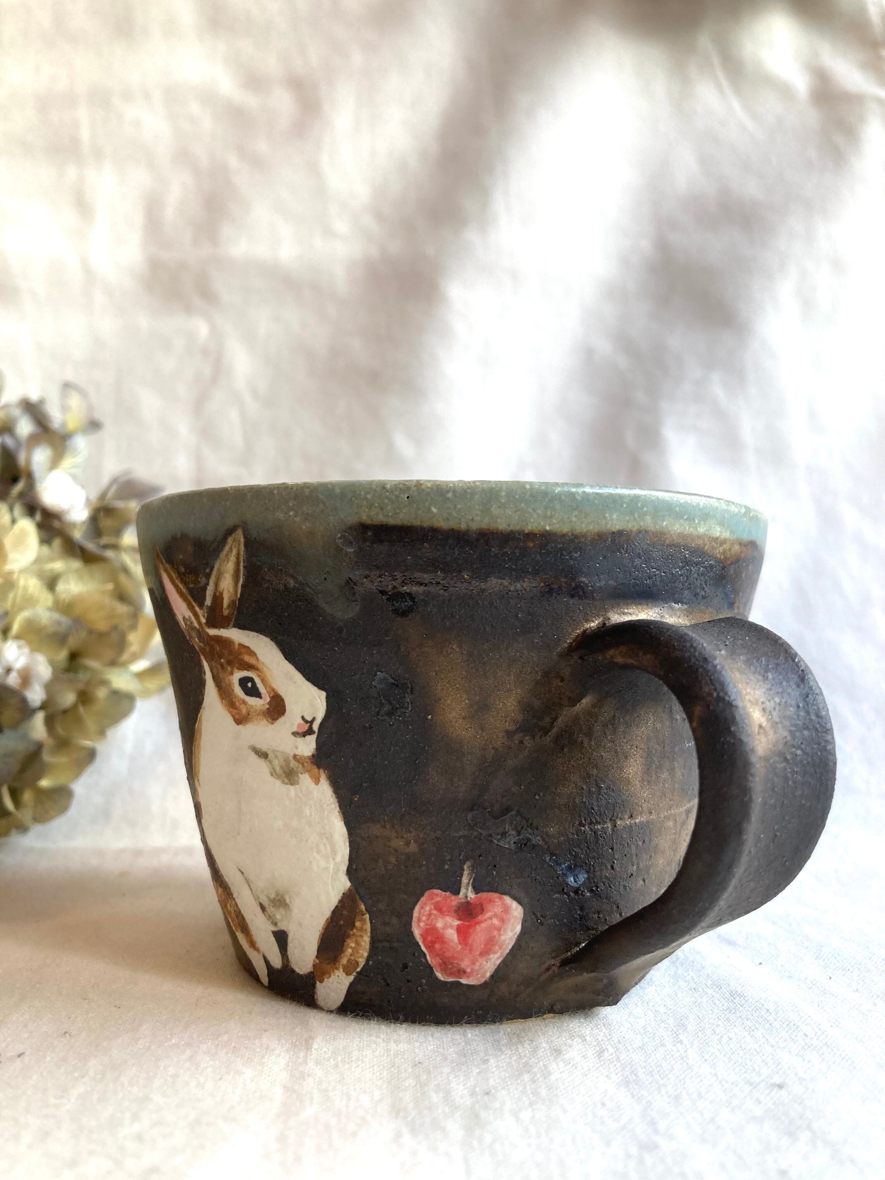 可愛らしいうさぎとりんごが描かれた、acne pottery studioさんのマグカップです。