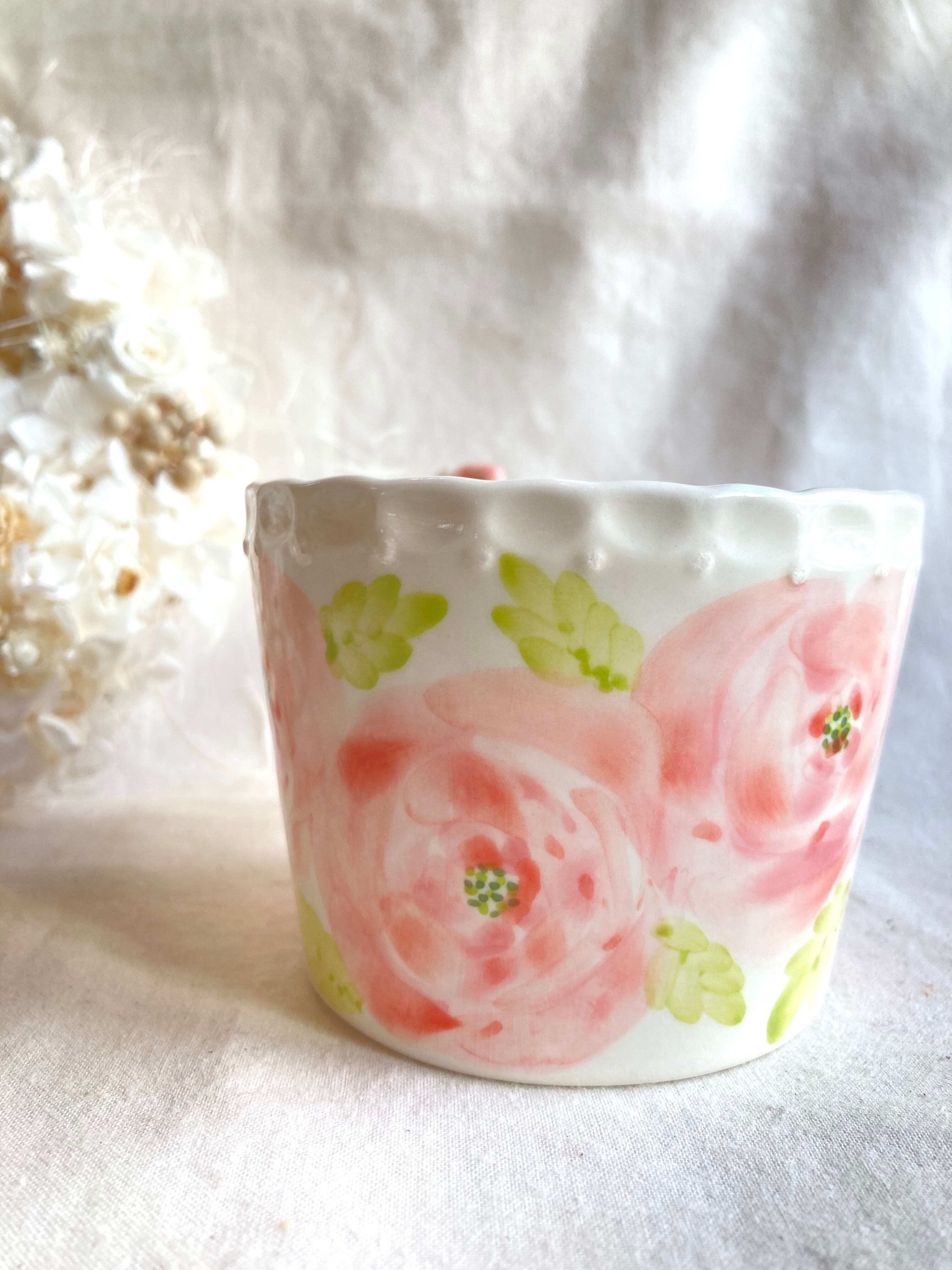 文鳥の取っ手が癒しの時間を演出してくれます。華やかな花柄が彩るデザインは、ティータイムやコーヒータイムを特別なひとときに変えてくれます。