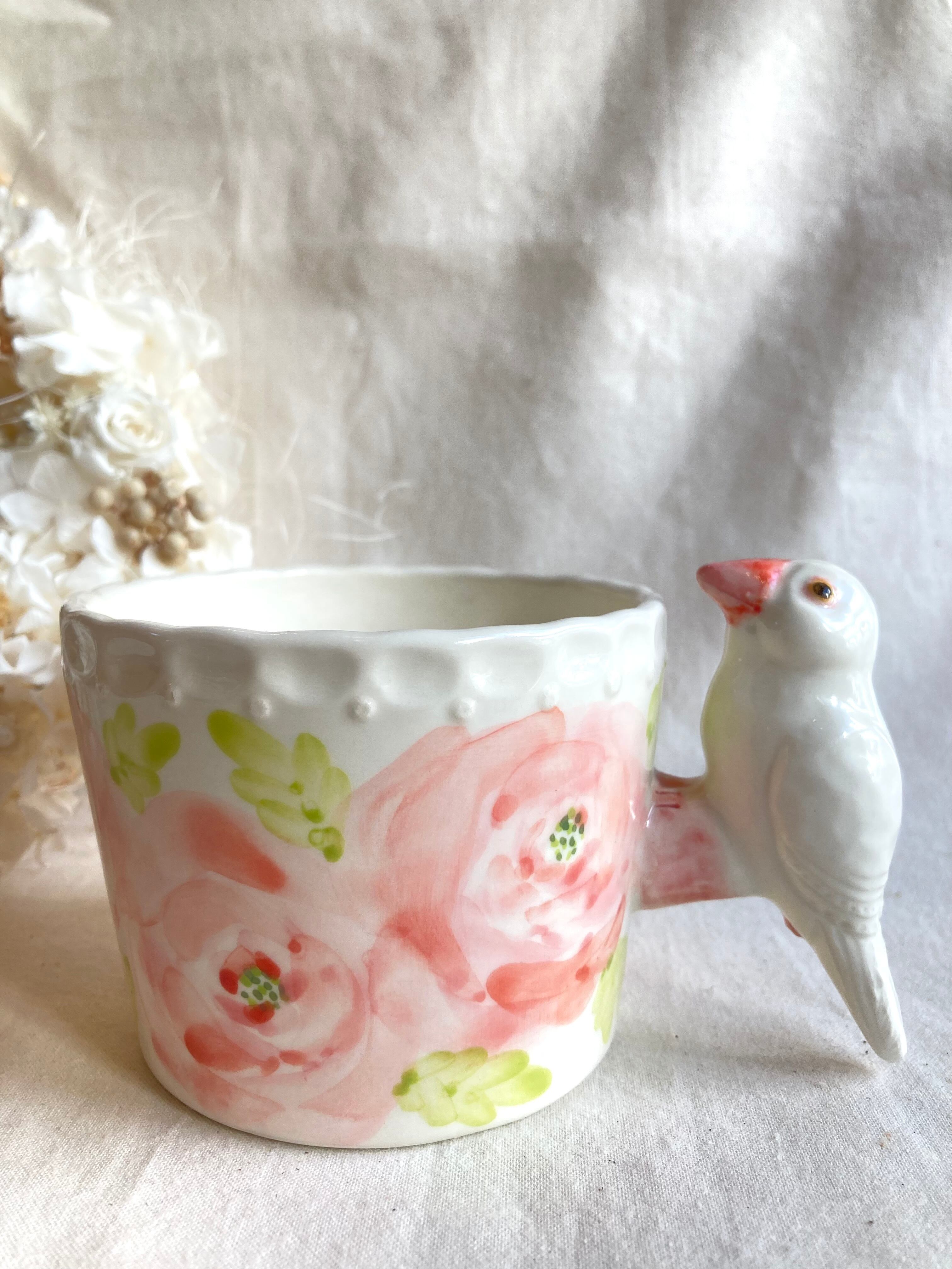 愛らしい文鳥の取っ手と可愛らしいお花が描かれた陶器のマグカップです。